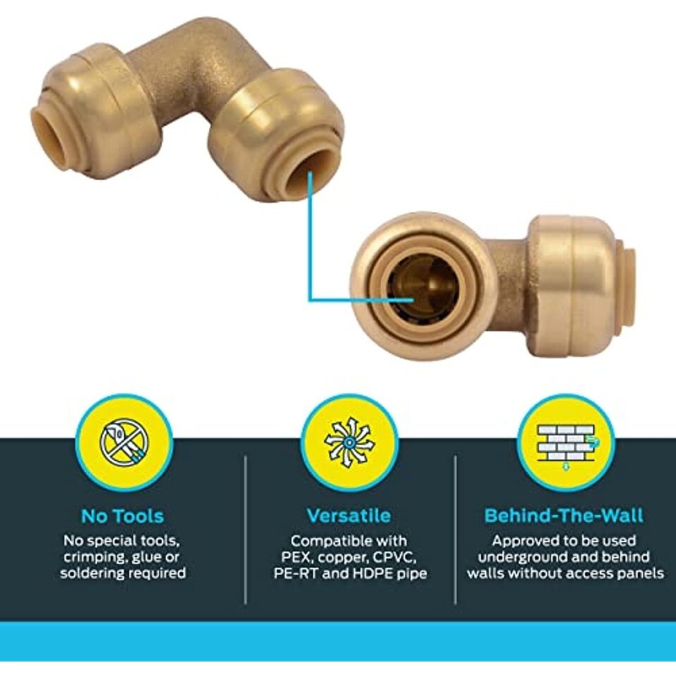 Product Description CUT. PUSH. DONE. Used to make 90 degree connection between two pieces of pipe. Compatible with PEX, copper, CPVC, PE-RT and HDPE pipes. The SharkBite Connection System makes any plumbing project fast and easy thanks to unique push-to-connect technology. When you insert a pipe into a SharkBite quick-connect fitting, the fitting's stainless-steel teeth bite down and grip the pipe, while its special O-ring compresses to create a watertight seal. No soldering, no clamps, no glue. SharkBite products work with your existing plumbing, are easy to disassemble for changing and reusing fittings, and can be rotated for installation in tight spaces. Whether you need to repair a broken pipe or plumb a whole house, SharkBite provides a push-to-connect solution and leak-free results. From the Manufacturer SharkBite U244LFA Elbow 1/4-Inch X 1/4-Inch Lead Free