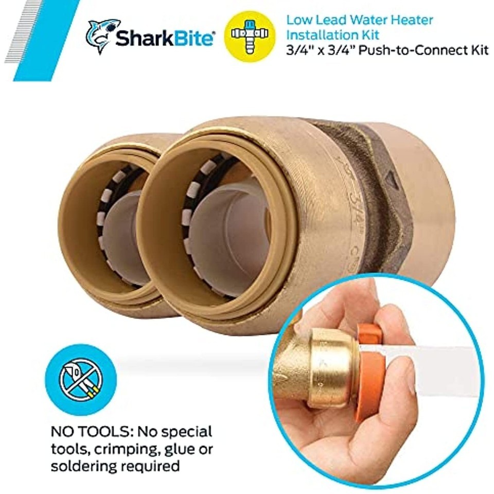 Product Description CUT. PUSH. DONE. SharkBite Water Heater Installation Kit is designed to streamline water heater installation including special corrosion resistant DZR brass push-to-connect fittings that allow you to connect water distribution pipe in seconds with ease. Our product works with your existing plumbing, is easy to disassemble for changing fittings, and can be rotated for easier installation in tight spaces. The SharkBite Connection System makes any plumbing project fast and easy with our unique push-to-connect technology. When you insert a pipe into the SharkBite quick connect fittings, the stainless-steel teeth bite down and grip the pipe, while the specially formulated O-ring compresses to create the perfect watertight seal. SharkBite push connect fittings are the no fuss way to fix small leaks or plumb a whole house. Whether you need to repair a broken pipe or plumb a whole house, SharkBite fittings are the push-to-connect solution for leak-free results. From the Manufacturer SharkBite is the push-fit connection system that's really taking hold. It's the easiest way to join copper, CPVC or PEX pipe in any combination - with no soldering, clamps, unions or glue. Just insert the pipe and the stainless steel teeth bite down and grip tight, while a specially formulated O-ring compresses to create a perfect seal. Disassembly is just as fast using the simple disconnect tool. So fittings and valves can be easily changed and reused. They can even be rotated after assembly for easier installation in tight spaces. Get SharkBite, and get a grip on your next plumbing project. These fittings are lead free and meet all requirements for plumbing in California and Vermont.