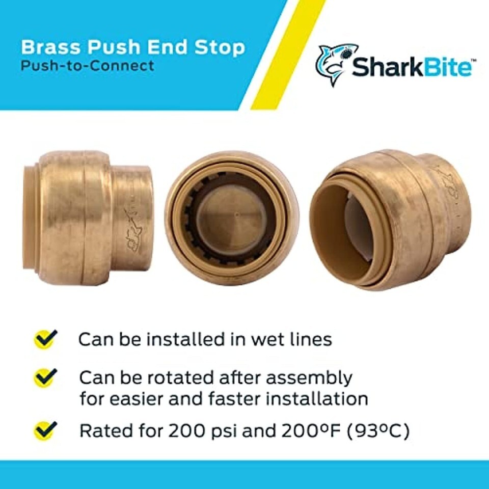 CUT. PUSH. DONE. Plug the end of PEX, copper, CPVC, PE-RT and HDPE pipe for a clean cutoff of the flow of water. Innovative push-to-connect design makes for quick and easy installation and removal. Ideal for working in tight spaces. Faster install time and ease of use reduces installation errors. The SharkBite Connection System makes any plumbing project fast and easy thanks to unique push-to-connect technology. When you insert a pipe into a SharkBite quick-connect fitting, the fitting's stainless-steel teeth bite down and grip the pipe, while its special O-ring compresses to create a watertight seal.