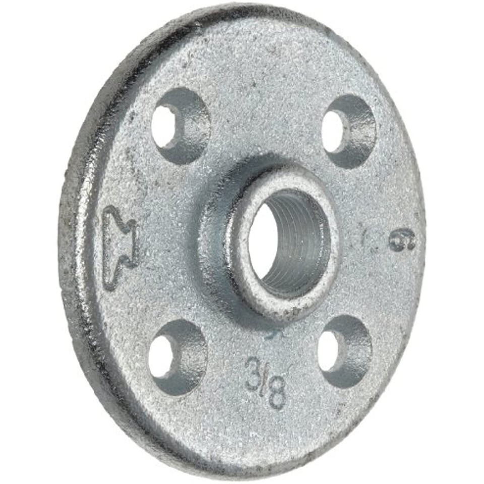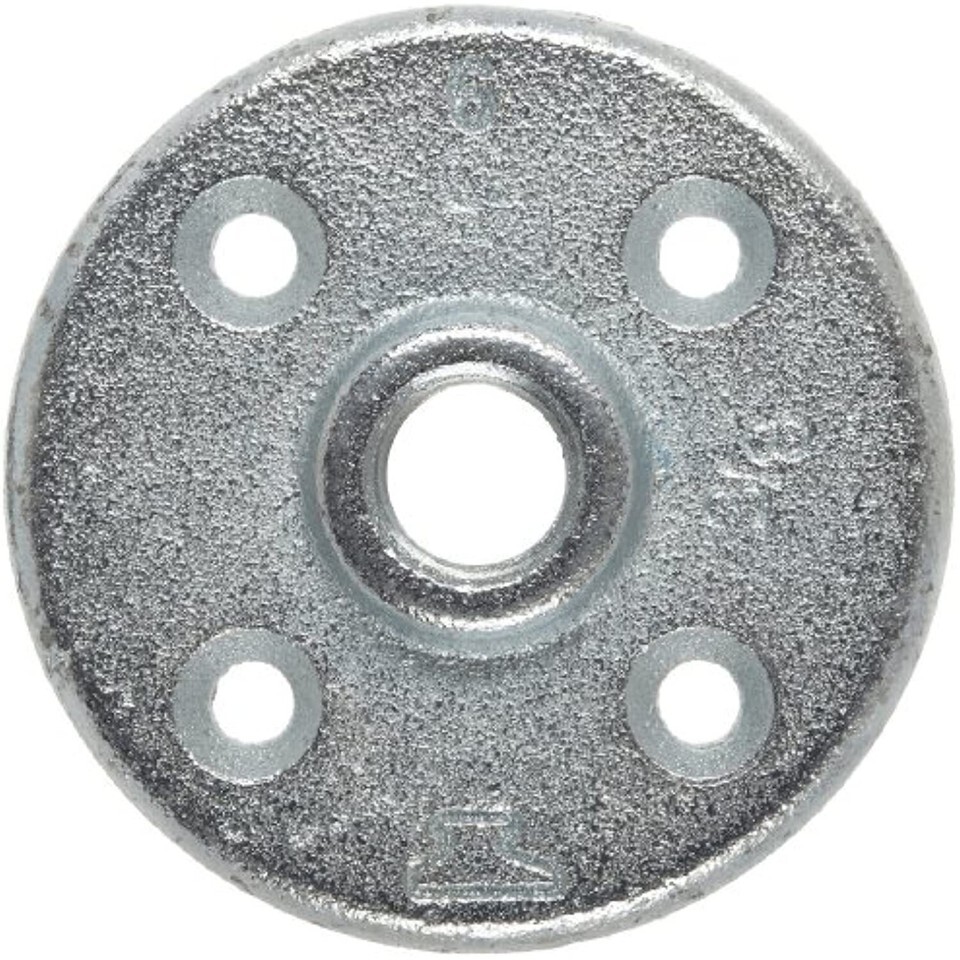 The Anvil floor flange is a class 150 malleable iron fitting with female National Pipe Taper (NPT) threads for securing pipe to floors or walls. It has NPT threads for creating a tighter seal than straight threads and bolt holes for connecting to flat surfaces. This flange is made of malleable iron, which has high tensile strength, and has a galvanized finish that resists rust in water, air, and steam applications. This class 150 fitting meets standards ASTM A-197, ASME B 1.20.1, and ASME B 16.3 for quality assurance. Class is a standard relating to tolerance, construction, dimension, and wall thickness, but it is not a direct measurement of maximum working pressure.Pipe fittings are components used for connecting, terminating, controlling flow, and changing the direction of piping in many different industries. When purchasing pipe fittings, consider the application, as this will affect material type, shape, size and required durability. Fittings are available threaded or unthreaded, in many shapes, styles, sizes, and schedules (pipe wall thickness).Anvil International provides pipe products and design services. The company, founded in 1850 and headquartered in Portsmouth, NH, meets International Organization for Standardization (ISO) 9001:2000 standards and is certified by the American Petroleum Institute (API). Its fittings meet American Society for Testing and Materials (ASTM) and American Society of Mechanical Engineers (ASME) specifications.