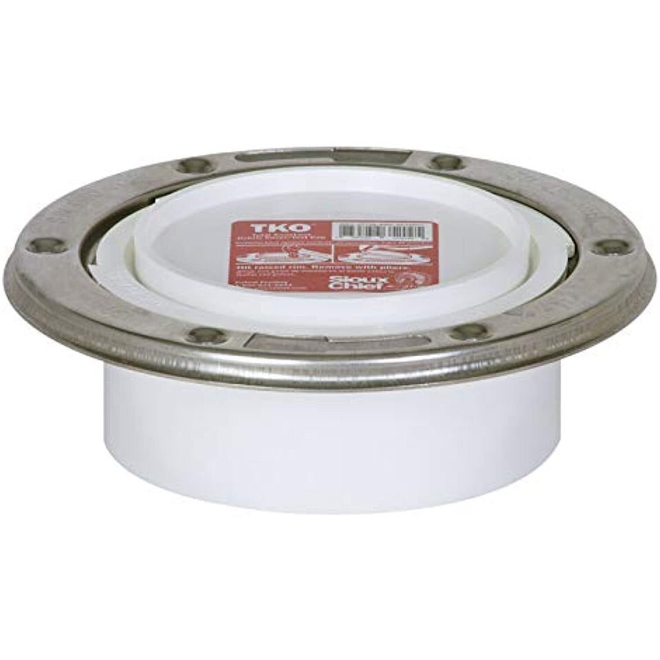 Sioux Chief 886 series TKO closet flanges shall be used where necessary in drainage systems. Flange shall have a full-swivel, corrosion-proof stainless steel ring, with sufficient holes for securing to floor and slots for inserting closet bolts. Flange shall have a knockout, sized larger than the opening, which comes out in one piece preventing it from falling down the drain line. Flange shall have a 3" Sch. 40 spigot connection which conforms to ASTM D2665 (PVC) or D2661 (ABS). Flange shall hold a standard head test and be UPC listed. Always fasten closet flanges to the floor. Features: Patent #5,377,361 Proven performance, improved design Knockout will not break apart and cannot fall down drain pipe Corrosion-resistant 430 stainless steel swivel ring is engineered for maximum strength Holds five floors (22 PSI) for head test Note: Image may not be actual representation of item.