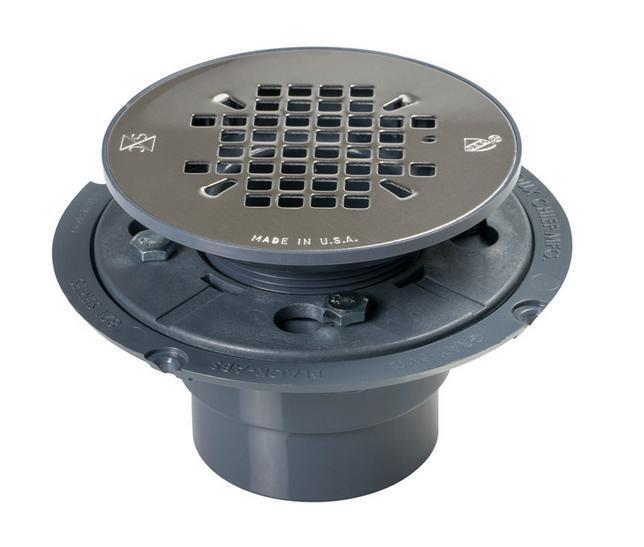 Sioux chief 821 series shower PAN drain shall be used where necessary in drainage systems. Drain shall have a beveled flashing base Adapter with mounting holes for sub floor installation. Strainer shall meet all load and flow requirements for installations in shower areas. Invertible clamping collar shall fasten to drain body with four screws that thread into brass inserts. Drain body shall have a 2" sch. 40 hub connection and connect to dev. pipe Via solvent weld joint. Designed in accordance with same A112.18.2-2005/CSA B125.2-05.