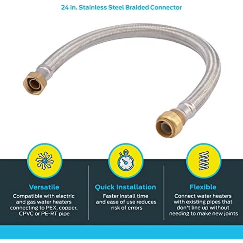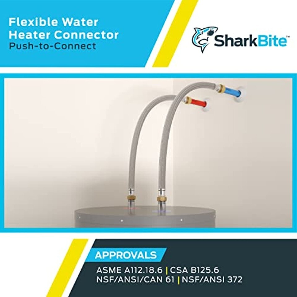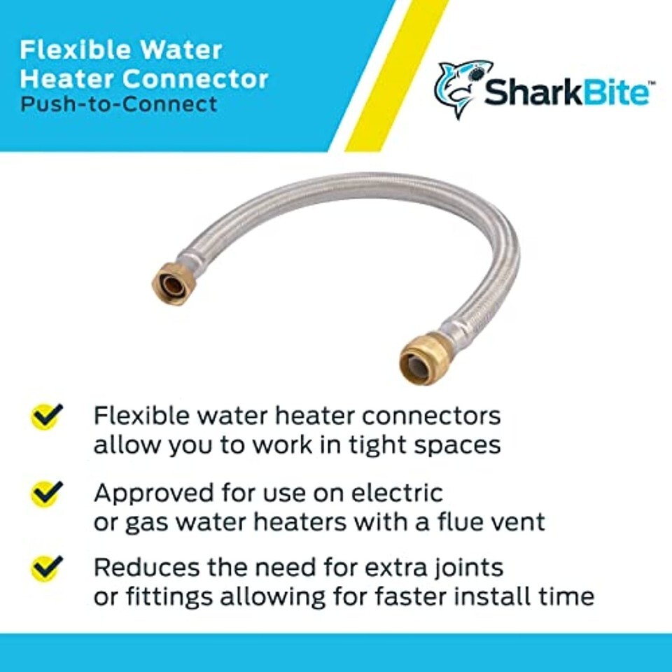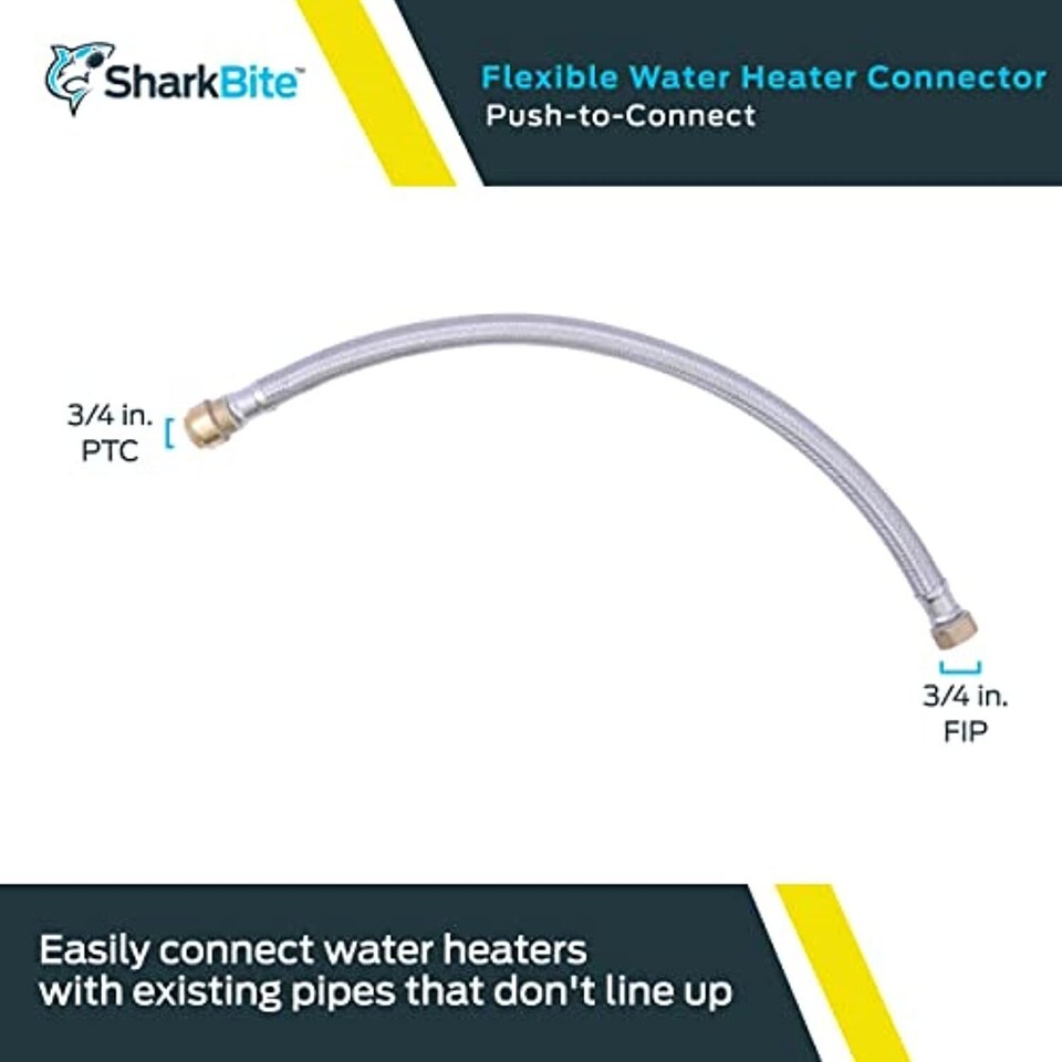 Product Description CUT. PUSH. DONE. This SharkBite Flexible Water Heater Connector is lead free. Our product works with your existing plumbing, is easy to disassemble for changing fittings, and can be rotated for easier installation in tight spaces. The SharkBite Connection System makes any plumbing project fast and easy with our unique push-to-connect technology. When you insert a pipe into the SharkBite quick connect fittings, the stainless-steel teeth bite down and grip the pipe, while the specially formulated O-ring compresses to create the perfect watertight seal. SharkBite push connect fittings are the no fuss way to fix small leaks or plumb a whole house. Whether you need to repair a broken pipe or plumb a whole house, SharkBite fittings are the push-to-connect solution for leak-free results. From the Manufacturer SharkBite U3088FLEX24LF Flexible Water Heater Connectors 3/4-Inch x 3/4-Inch FIP, 24-Inch Lead Free