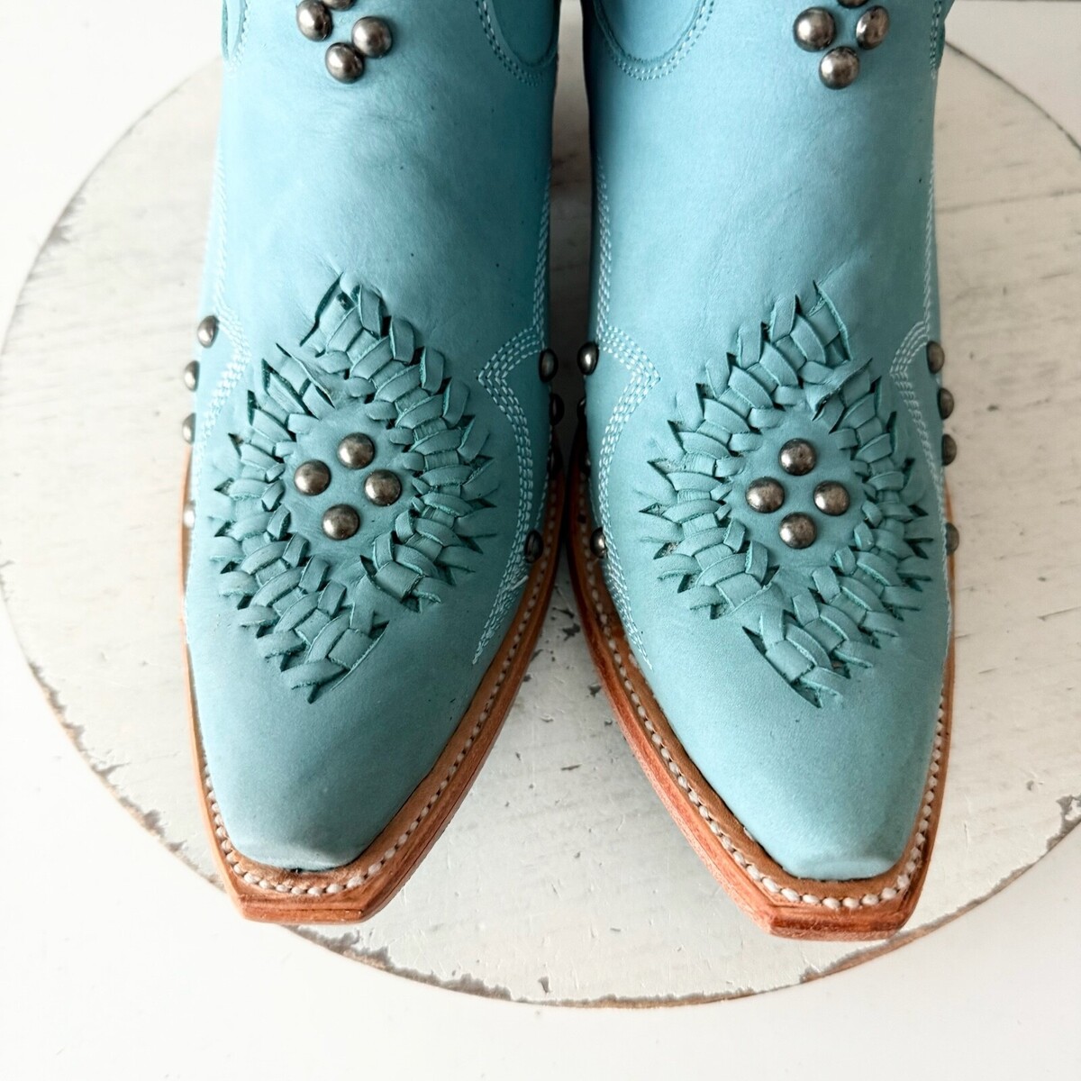 Lane COSSETTE Womens Cowboy Booties in Powder Blue Leather with Silver Studs, Detailed Leatherwork, and a Western Snip Toe