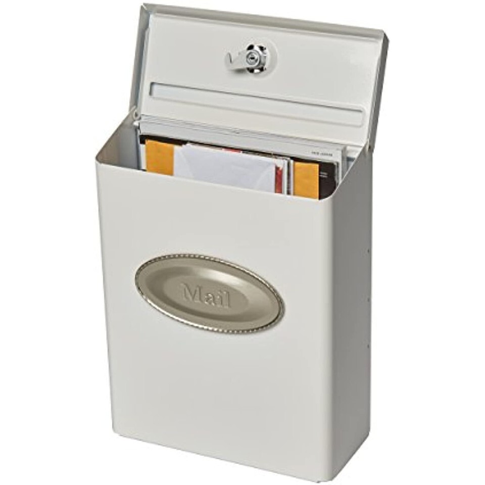 Carefully crafted for the ultimate in styling and security, the medium-sized Designer Locking Wall Mount Mailbox delivers on both aesthetics and functionality. Available in 5 colors, the rust-resistant galvanized steel construction is both durable and never goes out of style. The optional 'Mail' emblem allows you to customize the look and the concealed, locked compartment will keep your mail safe.