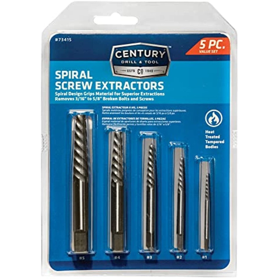 Spiral screw extractors are used when a screw or bolt has broken off while still in the fastening hole. 5 Piece set includes #1, #2, #3, #4 and #5 screw extractors. Easily removes 3/32" to 5/8" broken bolts and screws.