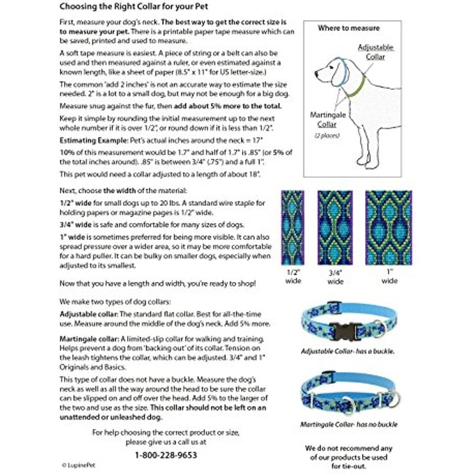 Lupine Originals are proudly built in Conway, New Hampshire and Guaranteed (Even if Chewed). They are not chew-proof (no fabric is!) but if they get chewed, the manufacturer will replace them. Search on Lupine Guarantee to see how EZ it is! For best fit read the sizing guide and always measure your pet's neck to determine the best size. Originals are made from woven nylon in an array of colorful designs. The pattern is woven into the webbing, rather than printed or sewn on. Available in collars, leashes and harnesses for many sizes of dogs.Care: Machine wash, warm water, mild soap (no bleach or bleach alternative). Air dry. Lupine products are not recommended for tie-out.
