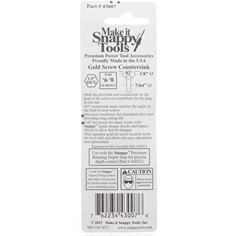 Drill the pilot hole and countersink or counterbore for screws in one easy step! The 82 countersink matches the angle on the head of most screws. Precision machined in the USA with tight tolerances. Made of thru-hardened alloy steel providing long cutting life. 1/4" hex power bit shank to fit in impacts and quick change chucks. Easily adjust or replace drill bit by loosening the hardened set screw that ensures a secure hold on the pilot drill. Utilize the Snappy Premium Roatating Depth Stop for precise depth control (Part # 43032) (Sold Seperately)