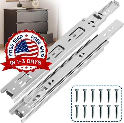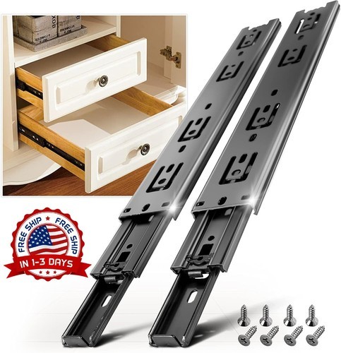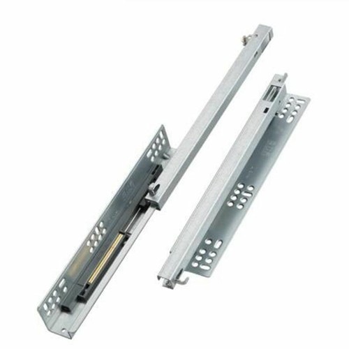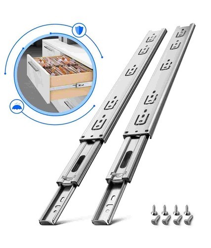 22", zinc finish, heavy duty full extension soft close drawer slide, 100 lb weight class, side mount with telescopic movement on ball bearings, integrated patented soft close mechanism, 32 mm hole pattern with direct access mounting, lever disconnect for easy drawer removal, non-handed design, recommended maximum drawer width of 24", contains 1 pair with screws.