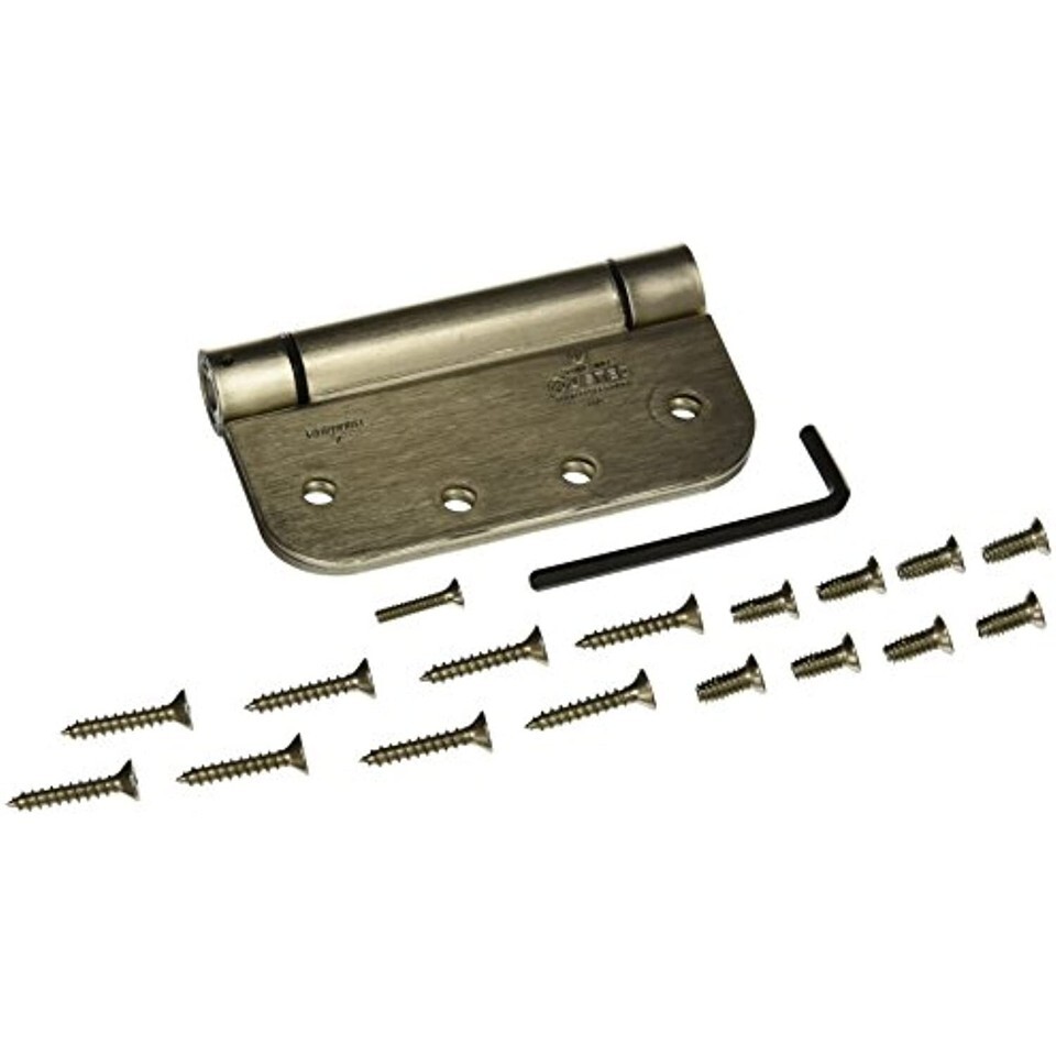 The Product Is 4" Spring Door Hinge - Adjustable Closing Speed And Tension - Cold Rolled Steel Construction - 5/8" Radius Round Corners - Satin Nickel Finish