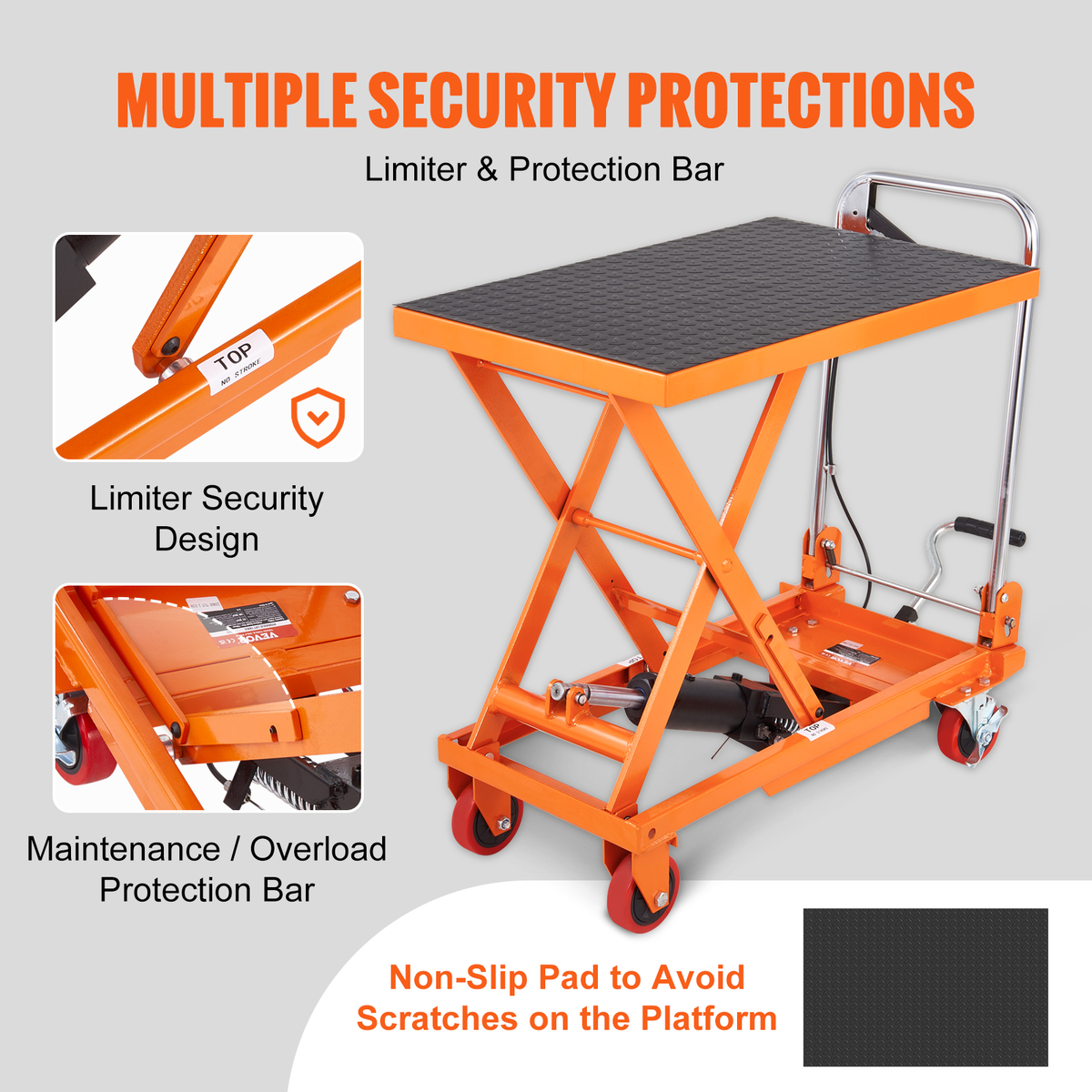 Secure Design: Our hydraulic table cart incorporates thoughtful security features, including limiter protection to prevent over-lifting. It also features a maintenance/overload protection bar for easy maintenance. For added stability during transport, we provide a rubber non-slip pad that prevents movement and enhances overall stability.