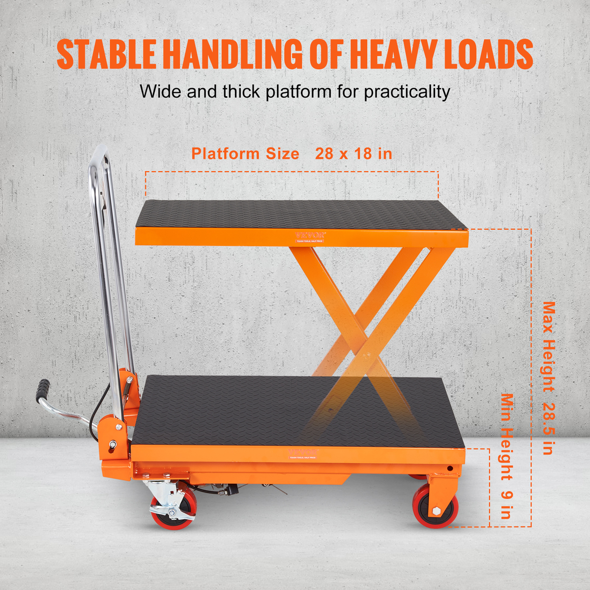 Premium Hydraulic Pump: Experience impressive lift heights up to 28.5 inches with VEVOR hydraulic lift table cart. Our high-quality integrated hydraulic pump ensures efficient and reliable lifting without any oil leakage issues. Get the power you need for smooth and controlled lifting performance.