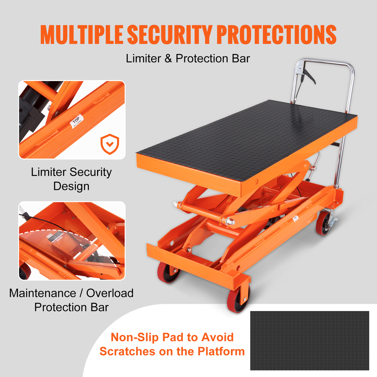 Secure Design: Our hydraulic table cart incorporates thoughtful security features, including limiter protection to prevent over-lifting. It also features a maintenance/overload protection bar for easy maintenance. For added stability during transport, we provide a rubber non-slip pad that prevents movement and enhances overall stability.