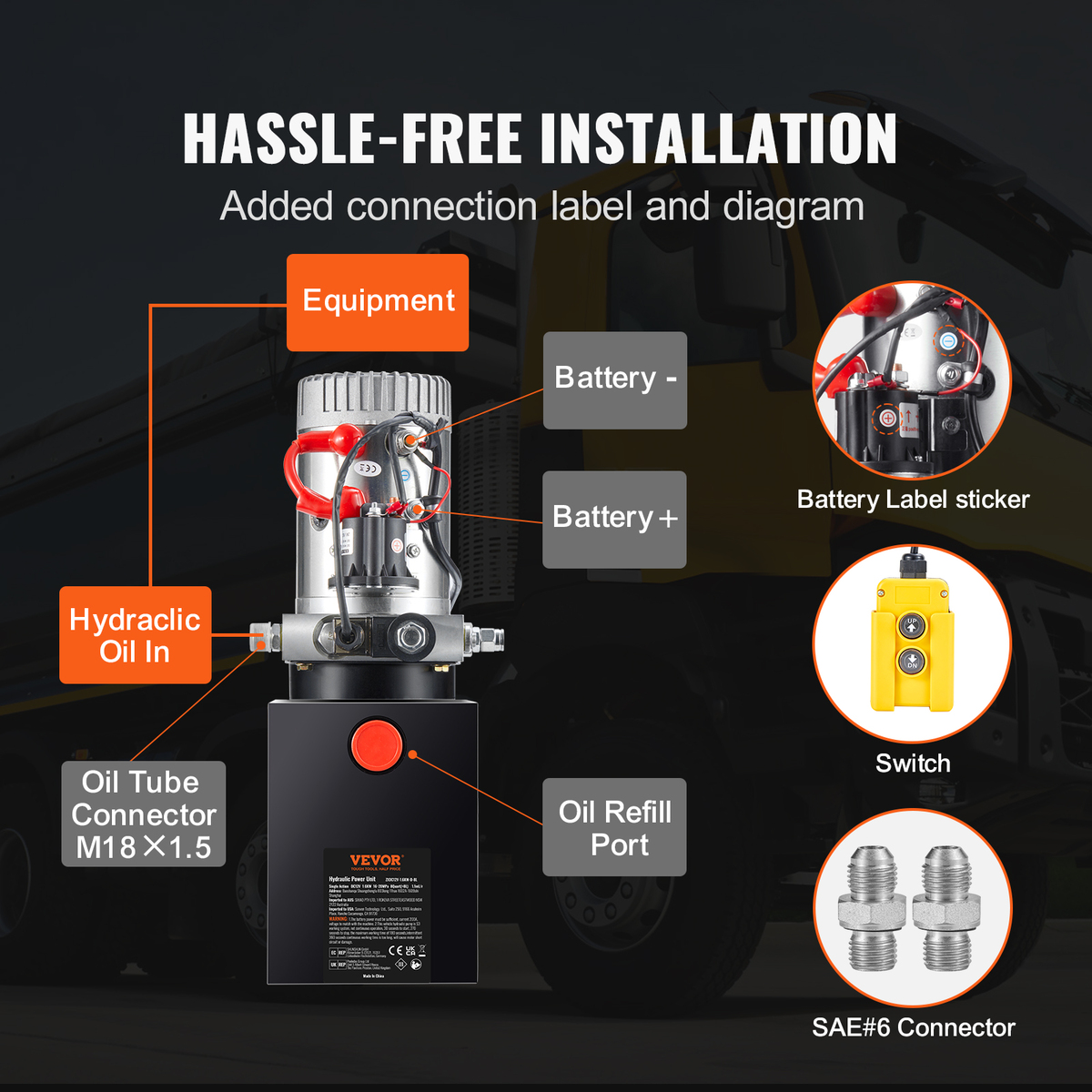Hassle-free Setup: The 12V hydraulic pump arrives pre-assembled. Add hydraulic oil and connect the power supply and tubing, and you're ready to start. VEVOR hydraulic pump includes an SAE#6 connector, making it compatible with metric and American interfaces for your convenience.