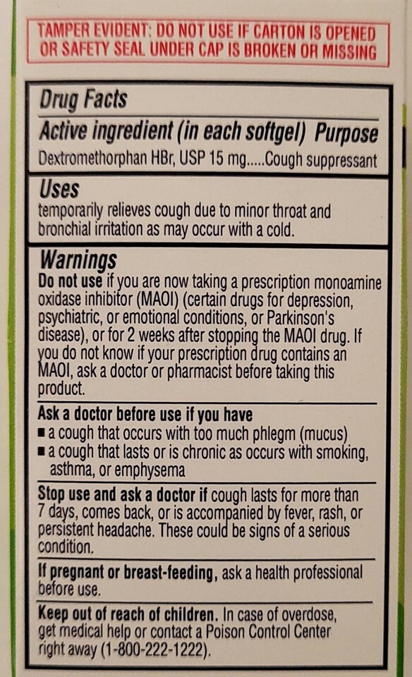 Dextromethorphane HBr 15 mg/Softgel Cough suppressant.