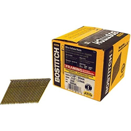 Stanley Bostitch S8DGL-FH 2,000-Qty 2-3/8" x .120" Smooth Shank 28 degree Wire Collated Full Round Head Stick Framing NailsStanley-Bostitch manufactures top-quality, innovative fastening tools and fasteners for industrial, construction and home improvement applications. Products include pneumatic staplers and nailers, compressors, manually operated staplers and tackers, coil-fed screw systems, rivet tools, glue guns, a broad assortment of collated nails, screws, staples and specialty fasteners in a variety of materials and finishes, plus office products and carton-closing staplers - many of them industry firsts. Stanley Bostitch S8DGL-FH 2,000-Qty 2-3/8" x .120" Smooth Shank 28 degree Wire Collated Full Round Head Stick Framing Nails Features: Thickcoat Galvanized framing nails fits Bostich tools F28WW, N79WW, N80SB, N86S, N88WWb, and N100S 28ยบ wire collated Diamond point style Smooth shank type Flat headStanley Bostitch S8DGL-FH 2,000-Qty 2-3/8" x .120" Smooth Shank 28 degree Wire Collated Full Round Head Stick Framing Nails Specifications: Fastener Length: 2-3/8" Fastener Shank Diameter: .120 Finish: Thickcoata? Fits Bostitch Tools: N79WW, N80SB, N86S, N88WWB, N100S, F28WW Point Style: Diamond Quantity Per Item Pack: 2,000 Shank Type: Smooth
