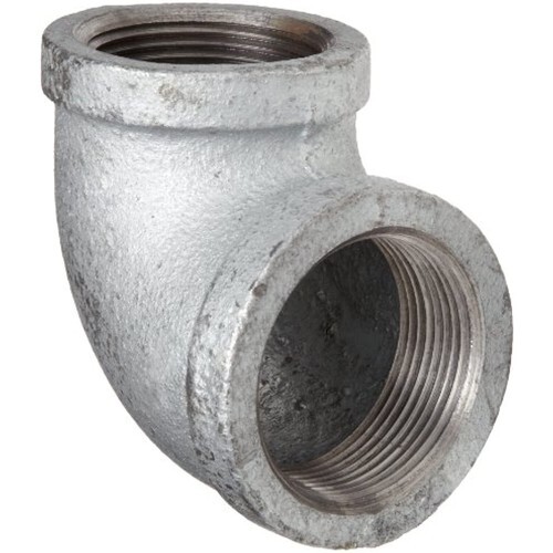 The Anvil 90-degree reducing elbow is a class 150 malleable iron pipe fitting with female National Pipe Taper (NPT) threads on both ends to connect and change the flow direction between two pipes of different sizes. The elbow has NPT threads for creating tighter seals than straight threads. It is made of malleable iron for use in gas, oil, and water applications and has a galvanized finish to help resist rust in water, air, and steam applications. This class 150 fitting meets standards ASTM A-197, ASME B 1.20.1, and ASME B 16.3 for quality assurance. Class is a standard relating to tolerance, construction, dimension, and wall thickness, but it is not a direct measurement of maximum working pressure.Pipe fittings are components used for connecting, terminating, controlling flow, and changing the direction of piping in many different industries. When purchasing pipe fittings, consider the application, as this will affect material type, shape, size and required durability. Fittings are available threaded or unthreaded, in many shapes, styles, sizes, and schedules (pipe wall thickness).Anvil International provides pipe products and design services. The company, founded in 1850 and headquartered in Portsmouth, NH, meets International Organization for Standardization (ISO) 9001:2000 standards and is certified by the American Petroleum Institute (API). Its fittings meet American Society for Testing and Materials (ASTM) and American Society of Mechanical Engineers (ASME) specifications.