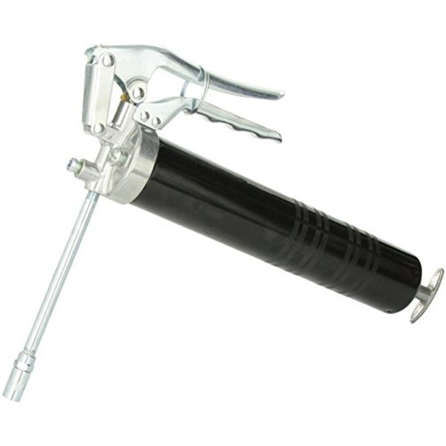 This standard duty pistol grease gun features easy one-hand operation. 2-way loading: 14 ounce cartridge or bulk load. Head cap port for adding air bleeder or bulk loader fitting. Develops up to 5,000 PSI and is equipped with 3-1/2 inch grease pipe and coupler. Includes 12 inch flex hose.