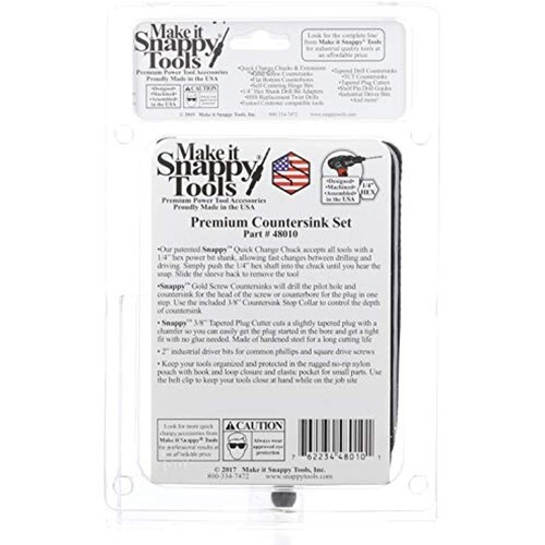 Drill the pilot hole and countersink or counterbore for screws in one easy step! The 82 countersink matches the angle on the head of most screws. Precision machined in the USA with tight tolerances. Made of thru-hardened alloy steel providing long cutting life. 1/4" hex power bit shank to fit in impacts and quick change chucks. Easily adjust or replace drill bit by loosening the hardened set screw that ensures a secure hold on the pilot drill. Take advantage of the Snappy quick change chuck that is included with this set for a quick and easy change from drilling to driving. Utilize the Snappy Premium Roatating Depth Stop for precise depth control (Part # 43032) (Sold Seperately)