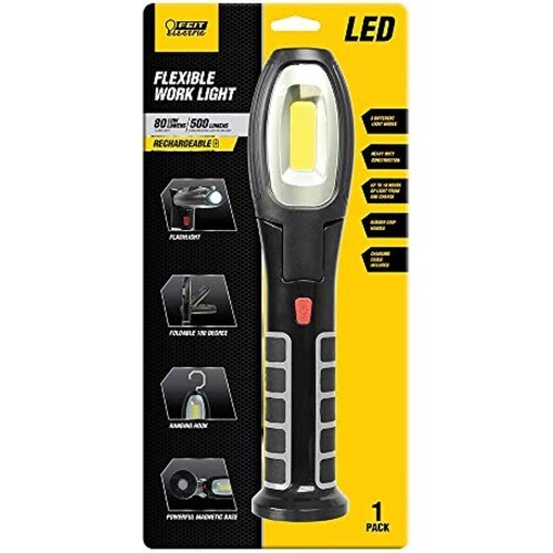Light up the worksite with the Feit Electric WORK500FLEXBAT handheld LED work light. with a foldable neck Durably constructed and long lasting, this super thin work light outputs 500 lumens of 6500K Daylight color temperature light. Flip the light to use the built-in 80 lumen flashlight on one end. An attached hook and magnet allows the work light to be easily carried and stowed anywhere. This light operates on a rechargeable lithium-ion battery that provides up to 11 hours of continual light. Choose a Feit Electric work light for your portable lighting needs.
