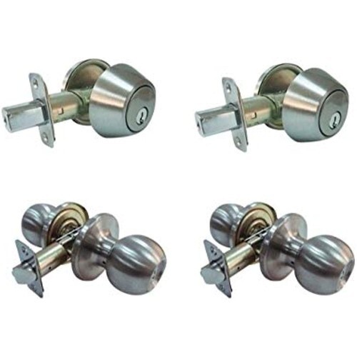 Brand Name: Faultless Style: Ball Finish: Satin Stainless Steel Material: Metal Product Type: Entry Knob and Single Cylinder Deadbolt Grade: 3 Grade Door Direction: Right Handed Knob Style: Full Ball Backset Dimension: 2-3/8 to 2-3/4 in. Maximum Door Thickness: 1-3/4 inch in. Minimum Door Thickness: 1-3/8 inch in. Packaging Type: Clamshell ADA Compliant: No Indoor or Outdoor: Outdoor Number of Keys Included: 4 Lockset Type: Keyed Number in Package: 2 pk Commercial or Residential: Residential