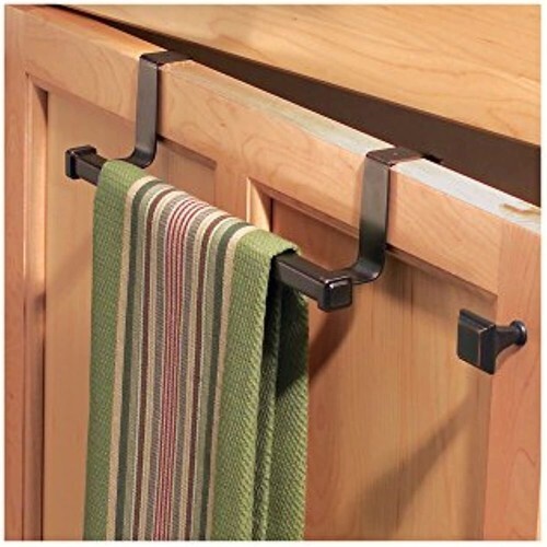 Organize your home in style with the iDesign Marvel Towel Bar. This innovative towel rack is designed to be placed over standard-sized cabinet doors to provide convenient storage and access to hand and dish towels near the sink, while the non-absorbent foam padding protects cabinets from scratching and damage. The versatile hanging design keeps towels clean and dry until ready for use and can be used in the kitchen, pantry, bathroom, or in any room around the home. Simply place over the cabinet door or the front of a drawer and start using it right away - no drilling or hardware required! It also features top screw holes for more secure installation. The durable steel construction with bronze finish stands up to every day use and matches a variety of decor styles. Measuring 9.7" x 2.4" x 5.6", this towel rack is ideal for adding storage in unused space. With iDesign by InterDesign, you can #LiveSimply every day.