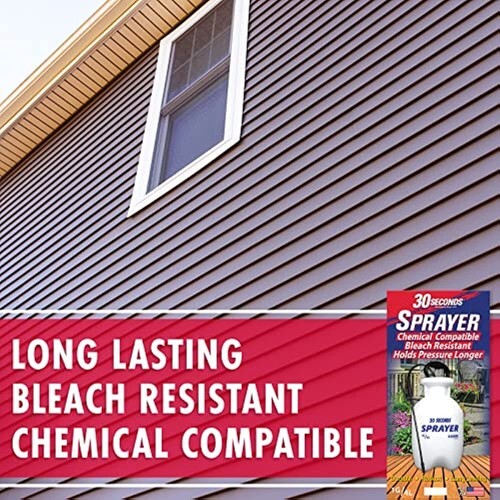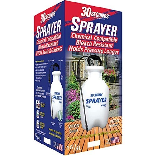 1 Gallon Tank Sprayer designed specifically for use with 30 SECONDS Cleaners. USA Manufactured for durability, chemical compatibility and bleach resistance, season after season. Our designed 30 SECONDS Tank Sprayer is equipped with chemical resistant Seals and Gaskets, a tough and robust sprayer that holds strong pressure longer. The best sprayer money can buy for all your home, garden, do-it-yourself projects around the home.
