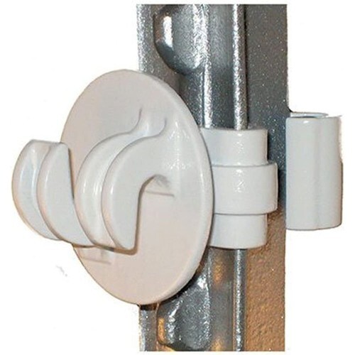25 Pack, white, T-Post insulator, for equip rope, coated wire, large diameter fence material sup to 3/8", fits 1.25 1.33 lb/ft. T-posts, large flange prevents arcing, snaps on around posts, molded of high density polyethylene with UV inhibitors for all weather performance. This product adds a great value. Product is highly durable very easy to use. This product is manufactured in China.