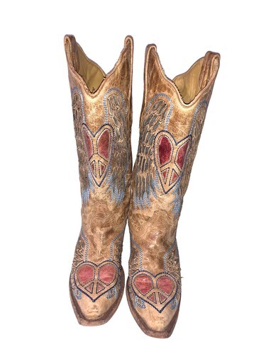 The Corral Size 8 M Western Red Heart Angel Wings Peace sign Womens Leather Cowboy Boots are a pair of mid-calf boots with a snip toe design and pull-on closure. Made of leather with embroidered angel wings and heart accents, these Western-style boots feature a comfortable insole and block heel for added flair. Perfect for casual occasions in all seasons, these boots embody a cowboy and cowgirl theme with a beige color and unique design that sets them apart from any other footwear.