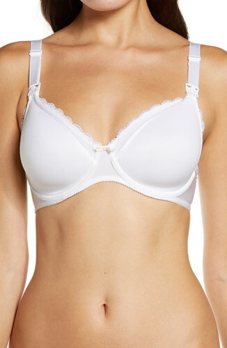 Lightweight and easy to maneuver, this full-fit nursing bra gets a smooth finish from spacer foam and is supported by lace side slings when unclasped.