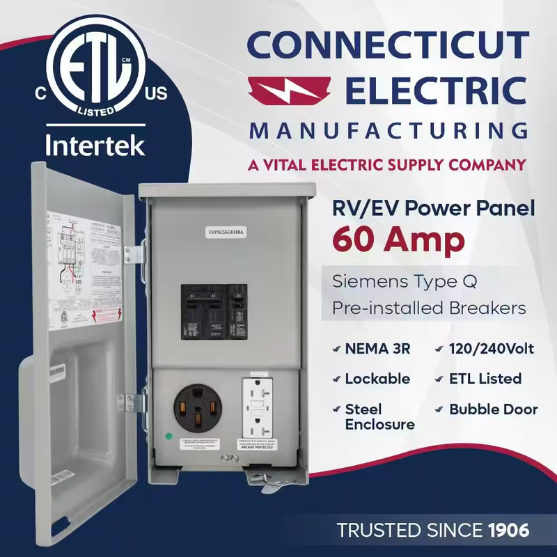 60 Amp RV Panel Outlet with 50 Amp Receptacle, Breakers and GFCI Duplex