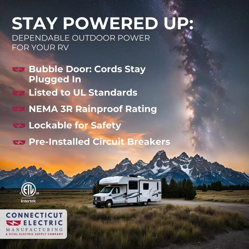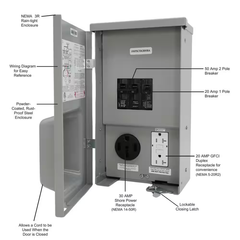 Perfect for the RV Owner that stores a motor home, camper, travel trailer or pop-up trailer and wants electricity close by, especially for a heater that will help prevent moisture and mildew from forming. Panel includes a 50 Amp receptacle and branch circuits: Single-Pole 20 Amp and Double-Pole, 50 Amp as well as a 20 Amp GFCI duplex receptacle. Safe and easy to install for the do-it-yourselfer because it is factory wired and completely assembled. The unique cover design allows the cord to be used when the door is closed. Some handled cords may not allow the door to fully close.