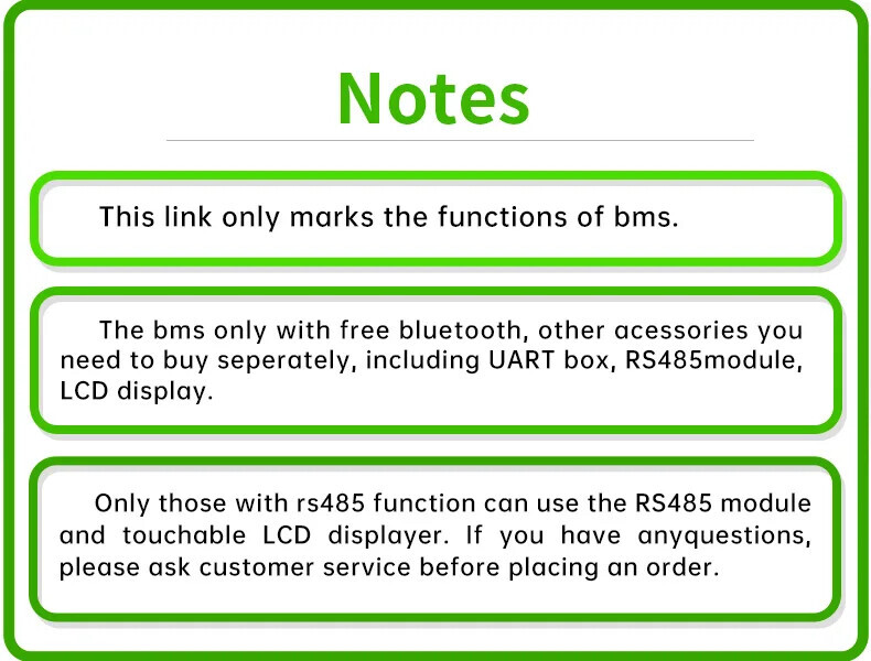 This BMS has a continuous current of 200A, you can choose UART RS485 and heating function (H), free Bluetooth, 2 NTCs, accessories and heating film (support about 5-10a, power 120W) need to be purchased separately.