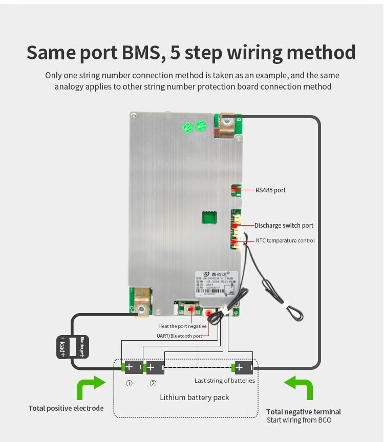 This BMS has a continuous current of 200A, you can choose UART RS485 and heating function (H), free Bluetooth, 2 NTCs, accessories and heating film (support about 5-10a, power 120W) need to be purchased separately.