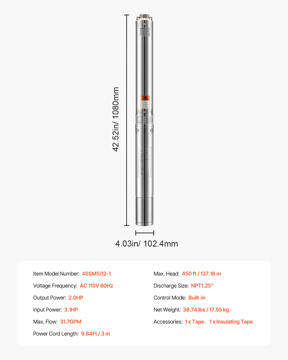 VEVOR Deep Well Submersible Pump, 2 HP Output, 115 V, 31.7 GPM Flow 450 ft Head