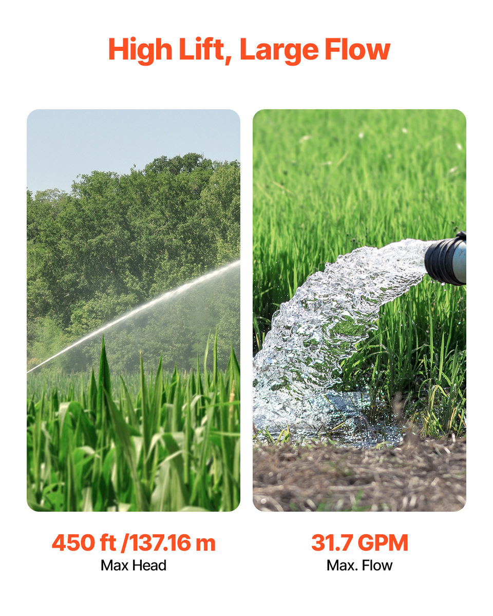 Large Flow, High Lift: This deep well submersible pump delivers powerful performance with 3.1HP input and 2HP output. Capable of reaching a maximum lift of 450 ft (137.16 m) and a flow rate of 31.7 GPM, it provides strong water pressure and a continuous, reliable water flow for all your needs.