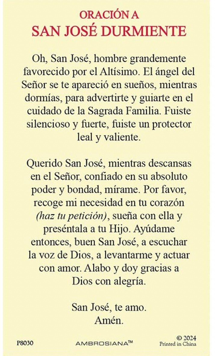 San José Durmiente, Oración Laminada en Español, Nueva #PCL-56