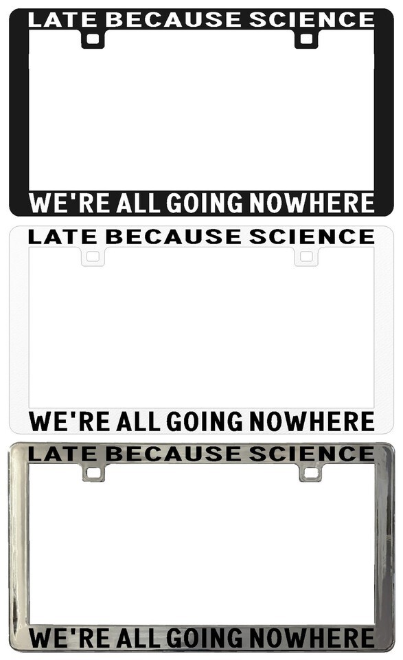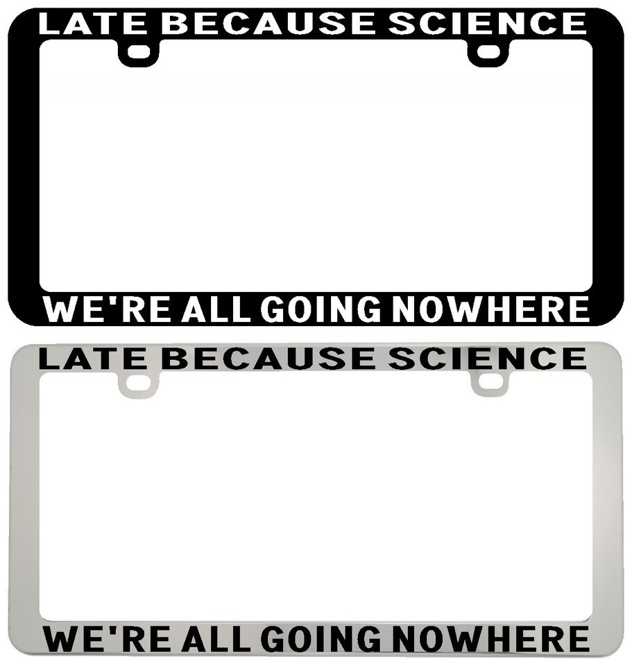 LATE BECAUSE SCIENCE WE'RE ALL GOING NOWHERE FAST. License Plate Frame