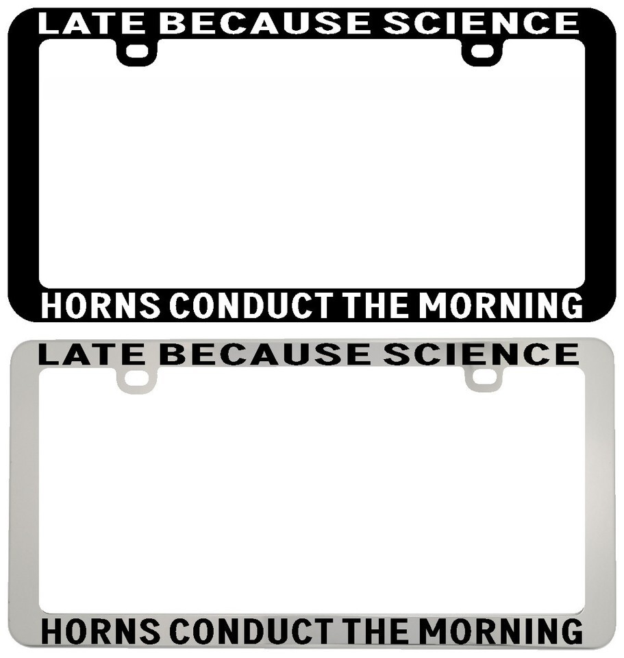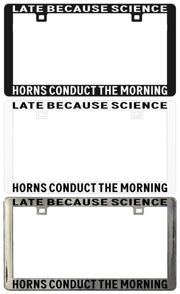 LATE BECAUSE SCIENCE HORNS CONDUCT THE MORNING. License Plate Frame