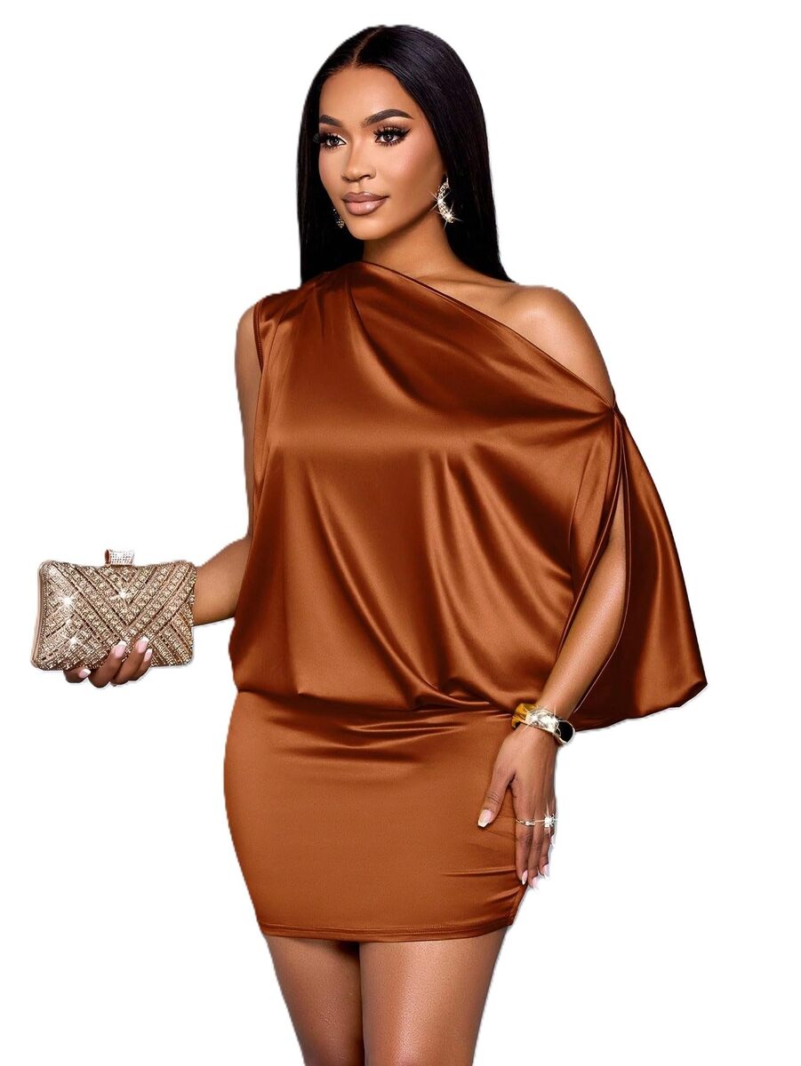 Product description: Make a statement with this Trendy Tron Elegant Asymmetric Collar Satin Bodycon Mini Dress, designed to showcase your figure with sophisticated flair. The luxurious satin fabric offers a slight stretch for comfort while maintaining a beautiful sheen that catches the light as you move. The distinctive asymmetrical neckline adds architectural interest to this sleek silhouette, making it a standout piece for special occasions. Featuring thoughtful details like ruching and draping that flatter your curves, this regular-fit mini dress creates an effortlessly chic look. Available in rich Brown, Mustard Yellow, and Dusty Pink, and sizes S through XL, this sleeveless design is perfect for formal events and nights out. Pair with statement jewelry and heels to complete this head-turning ensemble that balances contemporary style with timeless elegance.
