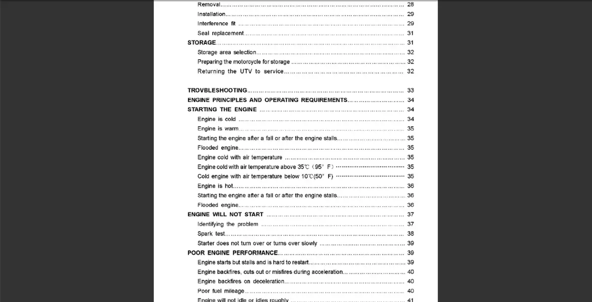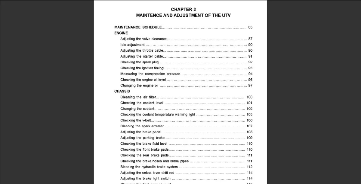 The Manual will give you complete step by step information on repair, servicing and preventative maintenance for your UTV.