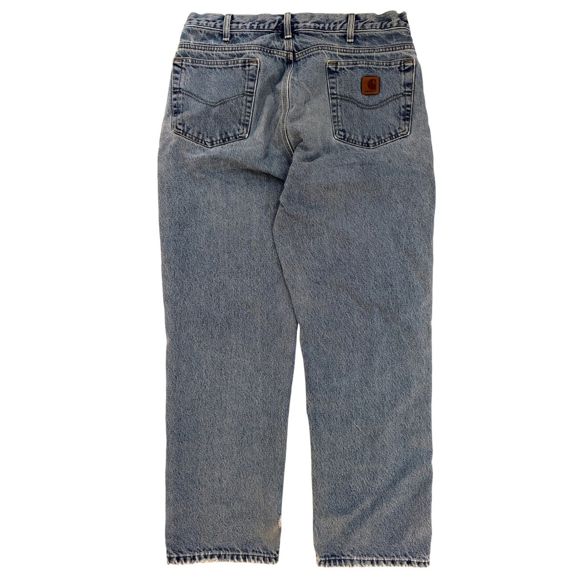 Well-worn and distressed Carhartt relaxed fit jeans, style B172 DST, size 35x32. Classic blue denim with plaid flannel lining. Made in Mexico of 100% cotton.