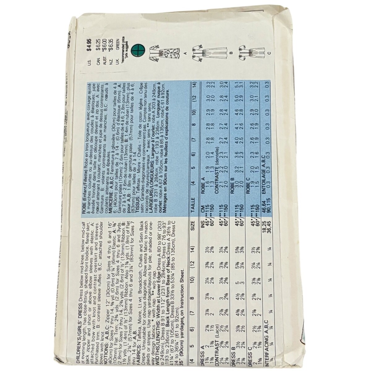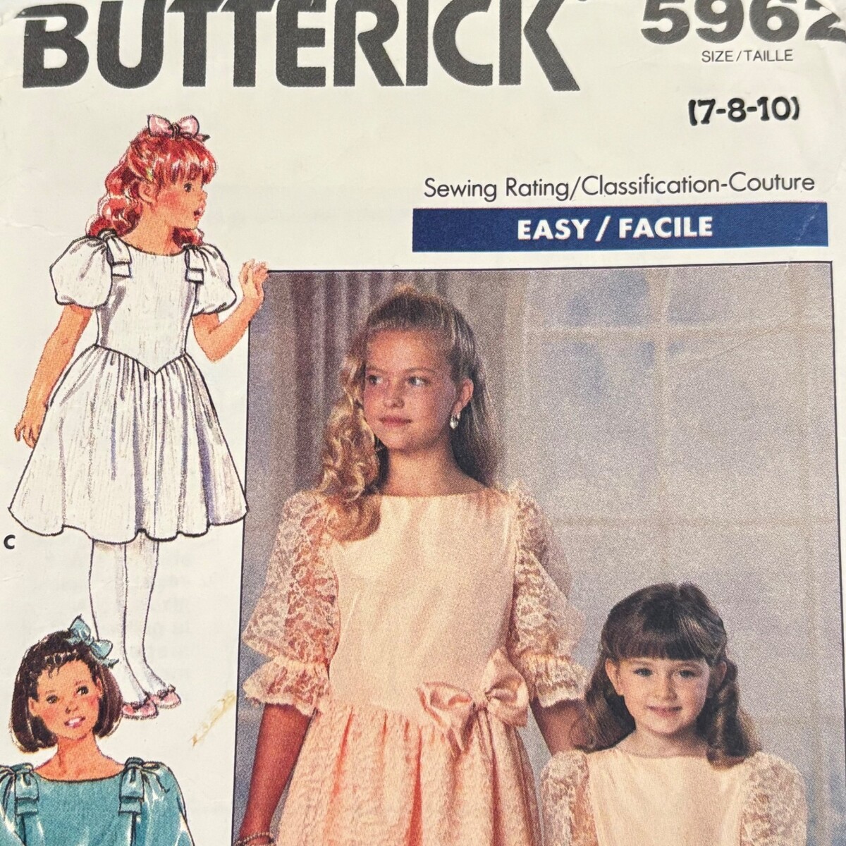 Butterick 5962 Girls Dress Sewing Pattern Sizes 7-8 Lace/Bow Details Easy Facile