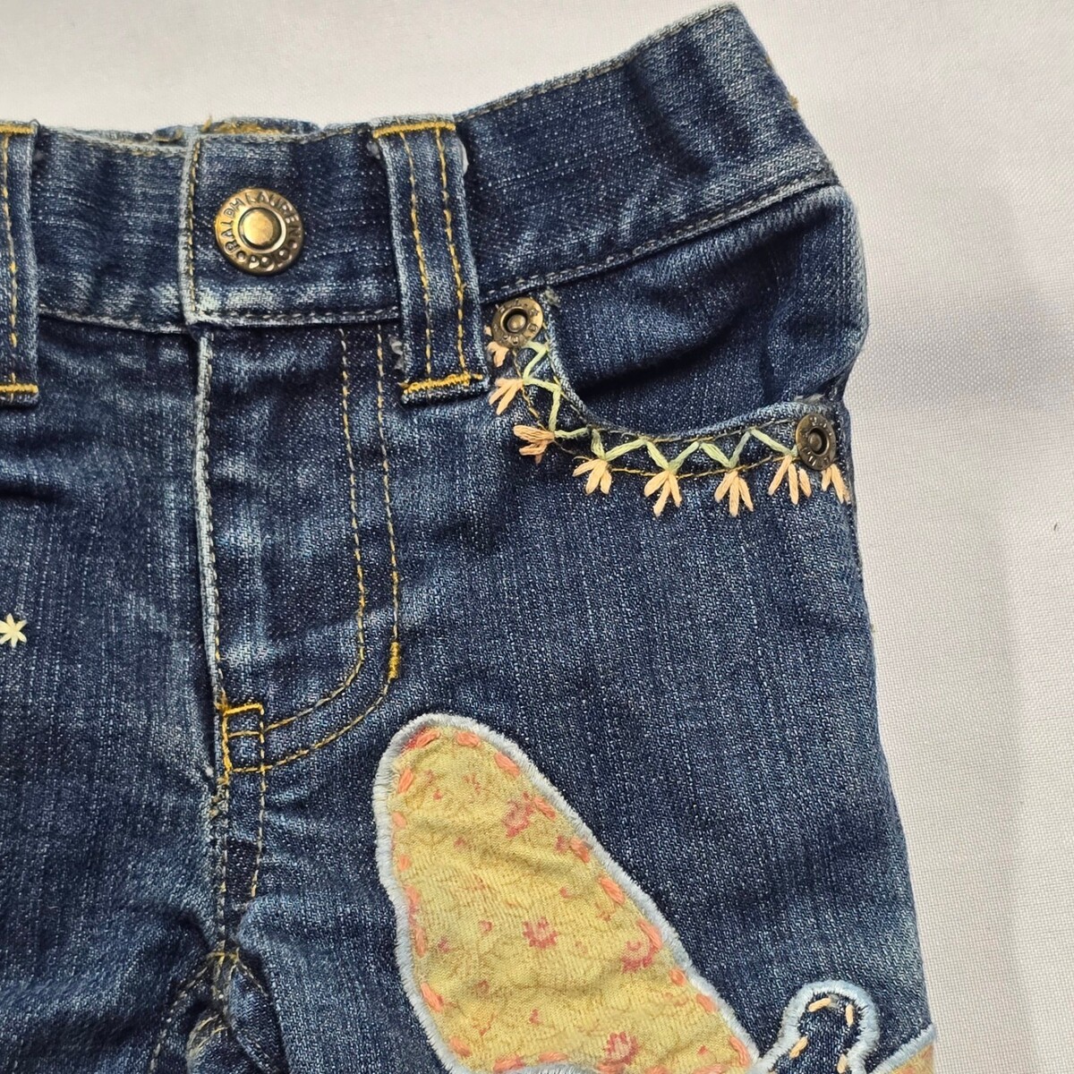 Keywords: baby girl denim, butterfly patch, embroidered heart, floral accents, stretch denim, distressed wash, bootcut, designer baby, spring fashion, summer outfit, playtime pants, comfortable fit, Vintage Y2K, cottagecore