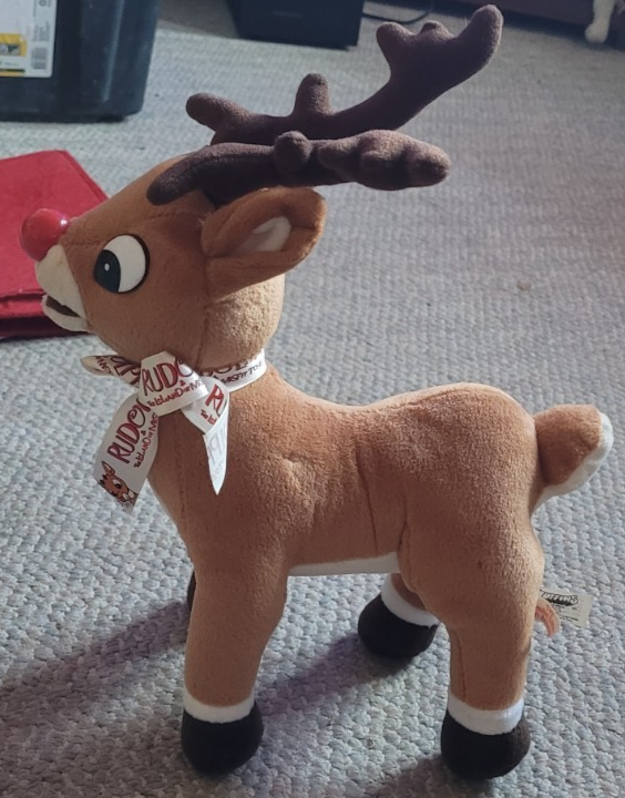 This stuffed Rudolph is in good used condition. There are no holes or stains that I found. It measures approximately: 11 inches long. 12 inches tall including the horns.