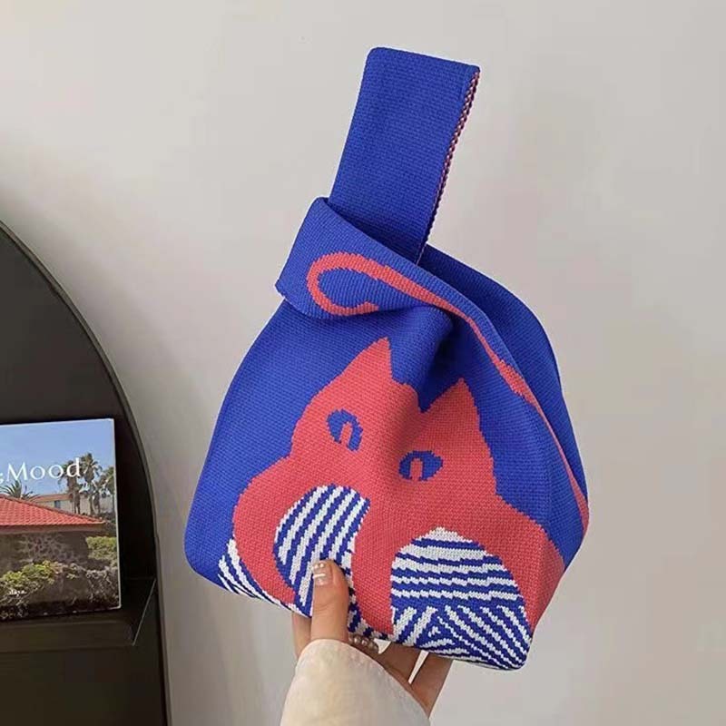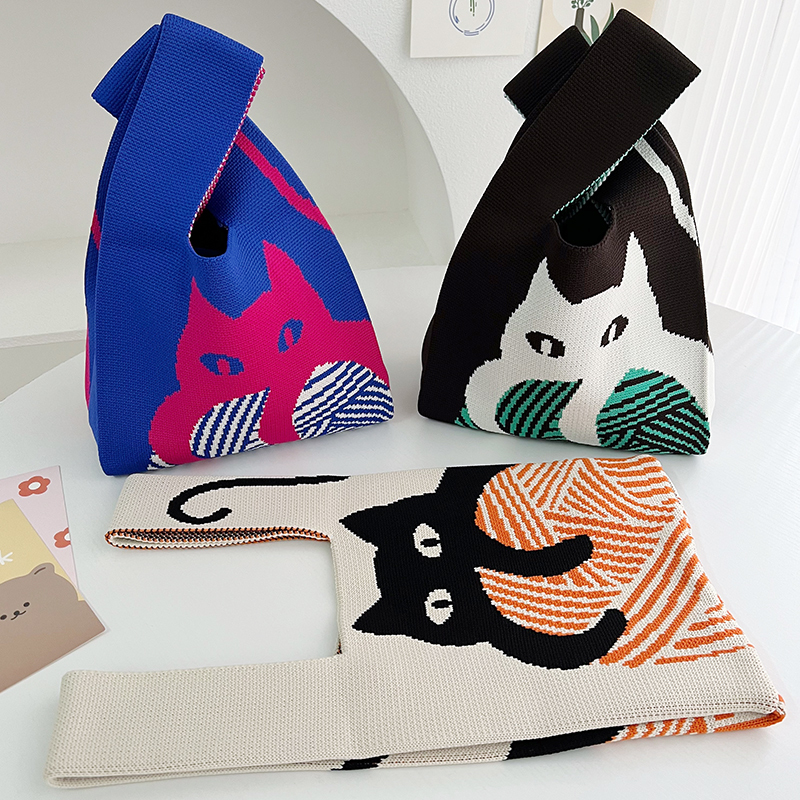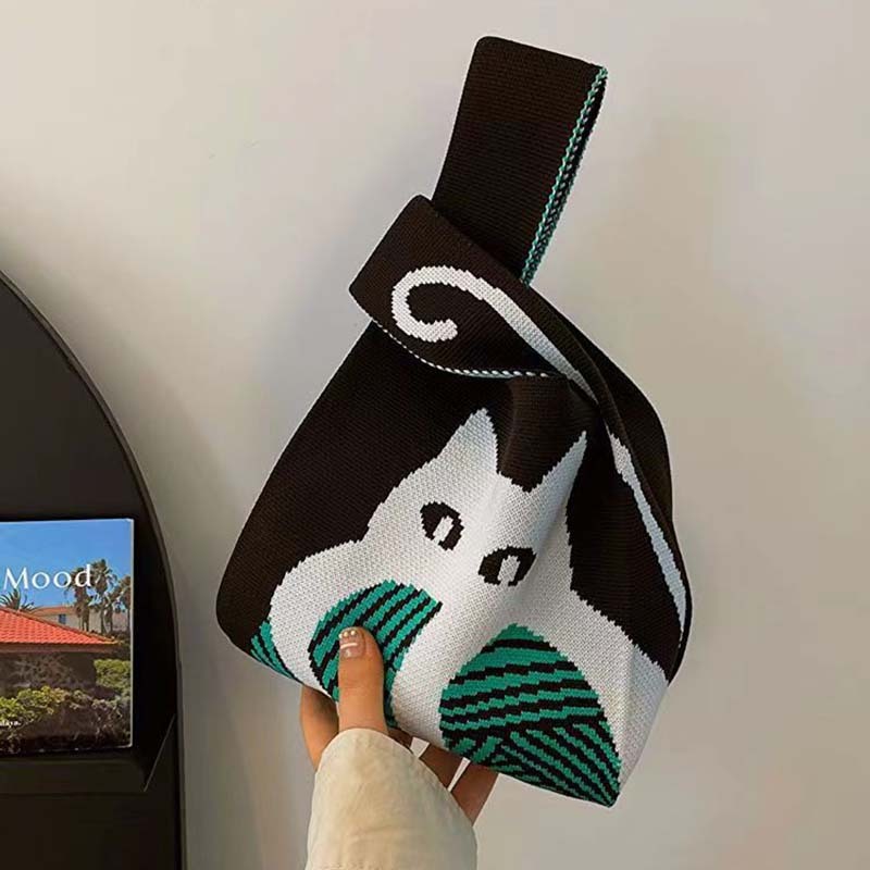 Handmade Knitted Mini Wrist Bag Fashion Tote Handbag Casual Woven Bags Cat