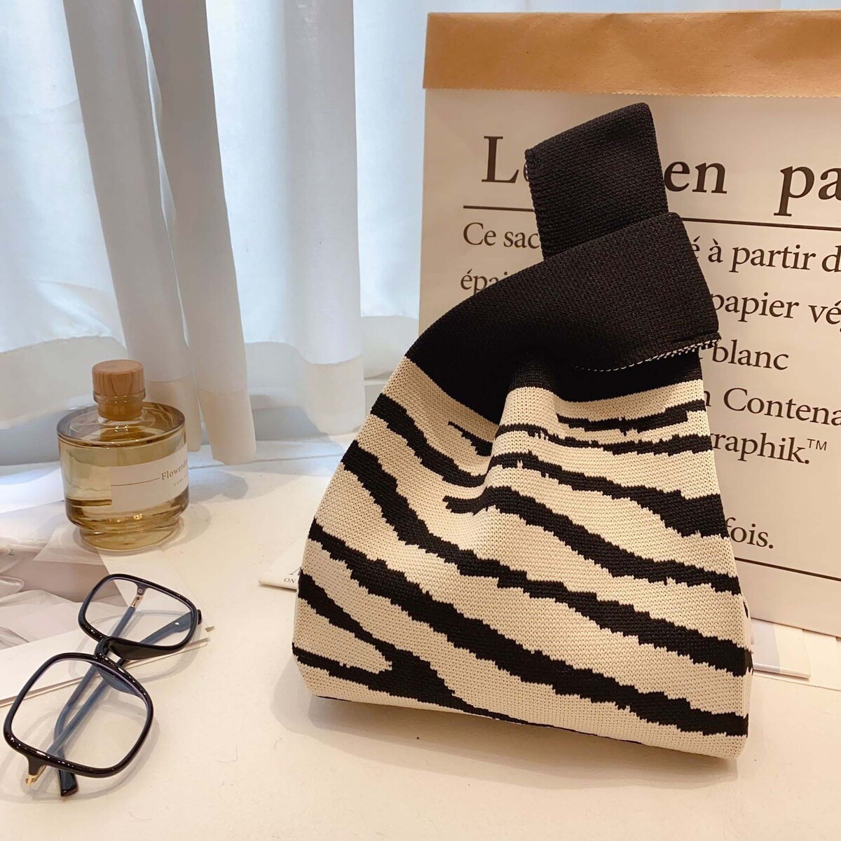 Handmade Knitted Mini Wrist Bag Fashion Tote Handbag Casual Shopping Bag Flower