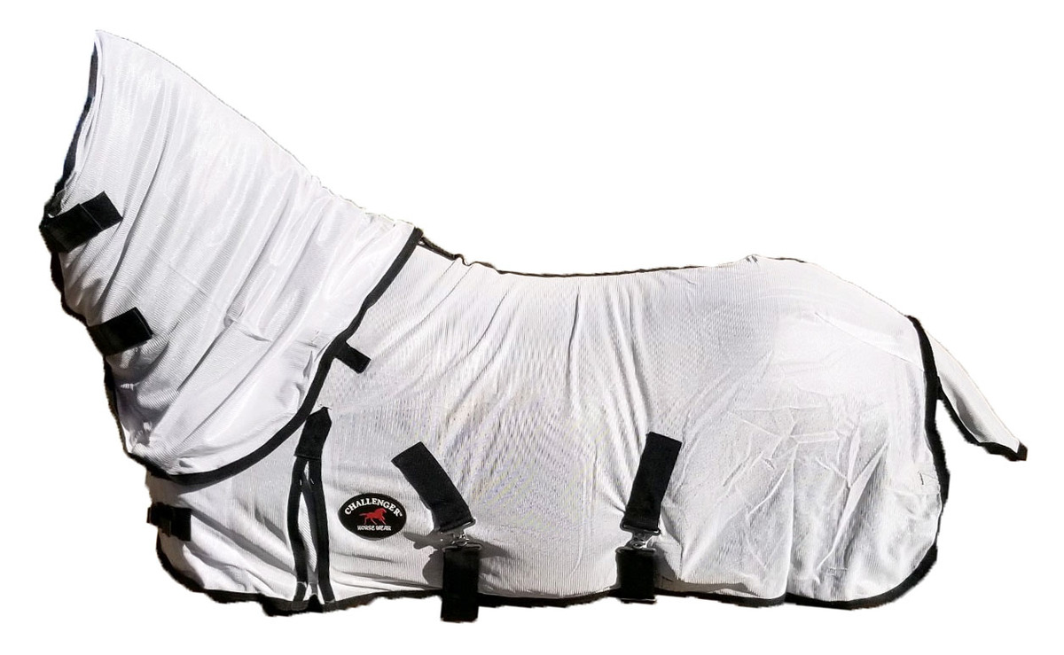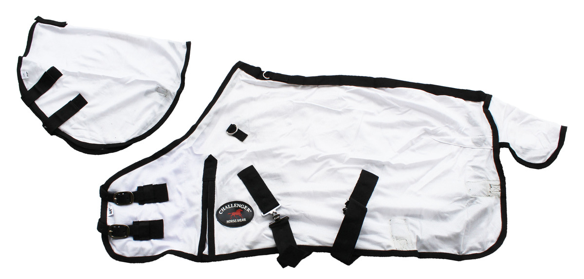 Challenger fly sheet with detachable neck made from soft poly nylon mesh which allows for air circulation. Provides protection for your horse against dangerous insects, bugs, and UV rays. Dual front buckle closure, adjustable surcingles, and elastic leg straps help secure sheet in place. Tail cover offers added protection. Shoulder gusset offers freedom of movement. Features rust-free stainless steel hardware.
