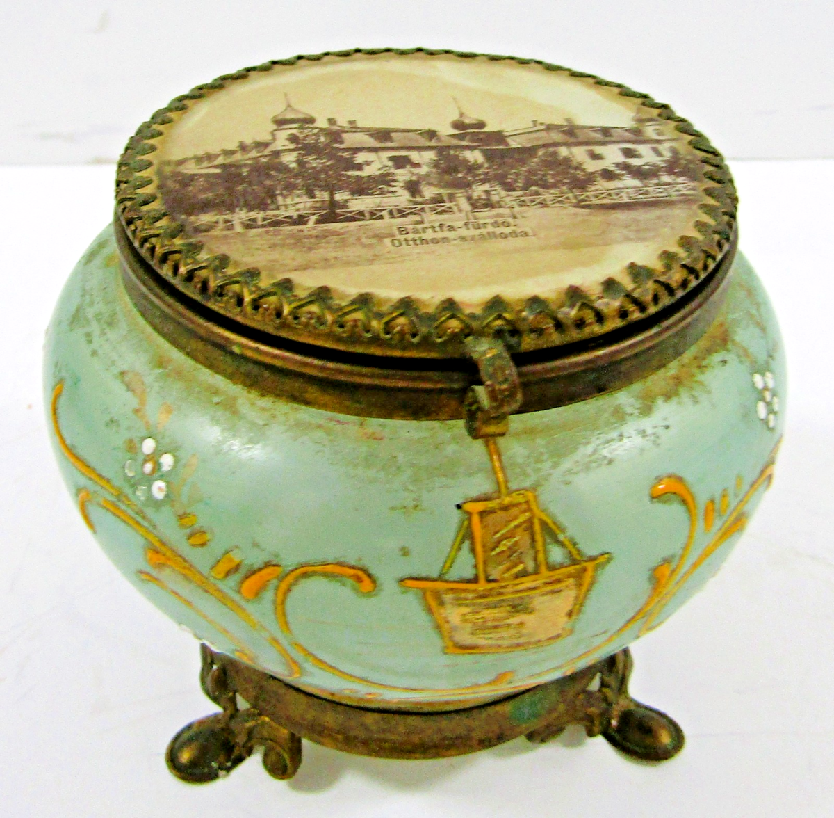 Antique Hungarian Bartfa-fürd? Otthon Szalloda Glass and Brass Lidded Box