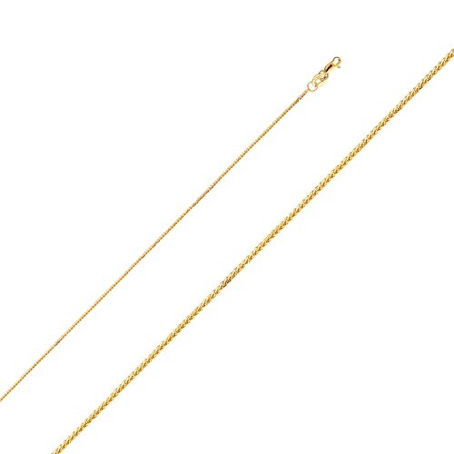 The pendant details reveal its thoughtful design: made from 14-karat yellow gold, it boasts a width of 15 mm and a length of 16 mm, with an estimated weight of 2.1 grams, making it a delicate yet substantial addition to your collection. The chain, also crafted from 14k yellow gold, features a stylish square wheat design, available in customizable lengths that cater to your personal preference.